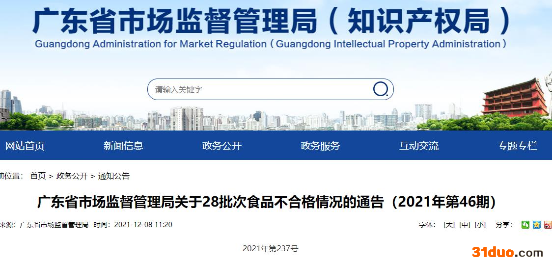中国经济网北京12月10日讯 广东省市场监督管理局(知识产权局)网站于12月8日公布的《关于28批次食品不合格情况的通告(2021年第