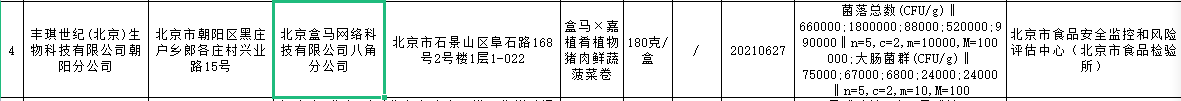 本次抽检发现,标称丰琪世纪(北京)生物科技有限公司朝阳分公司生产,北京盒马网络科技有限公司八角分公司经营的盒马×嘉植肴植物猪肉鲜蔬菠菜卷,菌落总数、大肠菌群不符合产品明示标准,规格180克/盒,生产日期为2021年6月27日,菌落总数检验结果为660000;1800000;88000;520000;990000,标准值为n=5,c=2,m=10000,M=100000,大肠杆菌检验结果为75000;67000;6800;24000;24000,标准值为n=5,c=2,m=10,M=100,检验机构为北京市食品安全监控和风险评估中心(北京市食品检验所)。