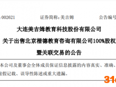 12月4日,美吉姆发布公告称,将3亿元买来的留学机构北京楷德教育咨询有限公司(“楷徳教育”)100%股份以1500万元出售给湖州唐文企业管理咨询有限公司。