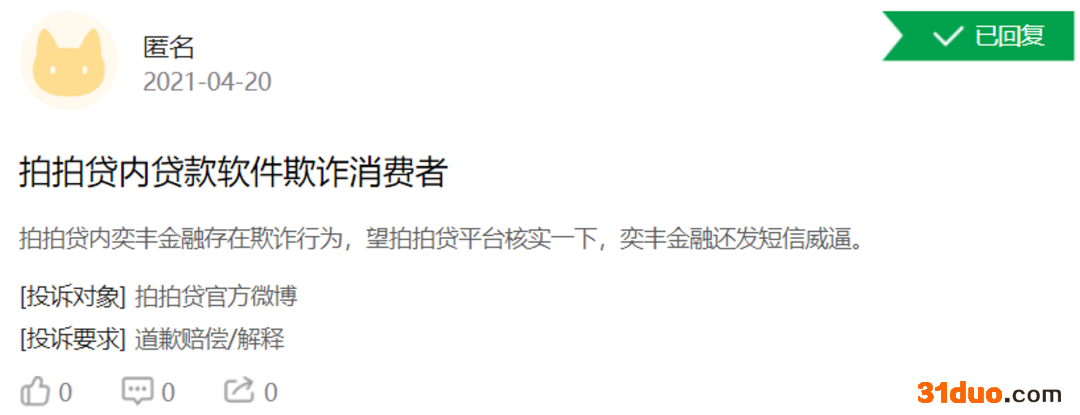值得关注的是,羚羊财富正是在2019年9月上线。另外,有用户于今年4月于黑猫平台投诉称,拍拍贷内的贷款软件奕丰金融存在欺诈行为,出现短信威逼情况。