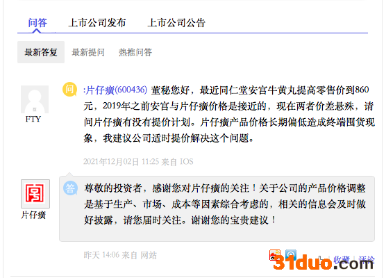 图|同仁堂安宫牛黄丸提价的消息传出后,有投资人在互动平台向公司了解片仔癀的提价计划。