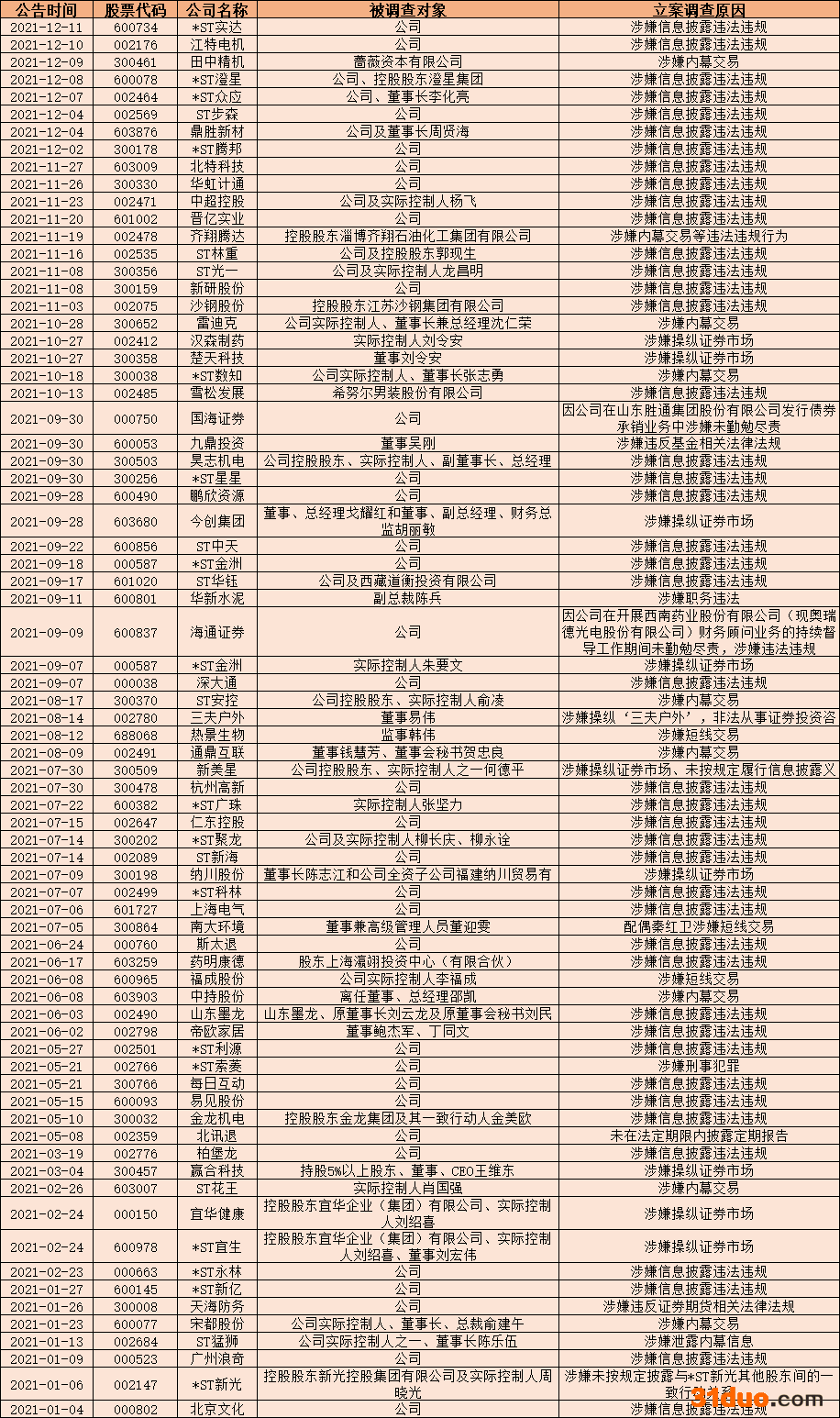 以ST花王(603007.SH)为例,今年2月23日,因涉嫌内幕交易,中国证监会对该公司实际控制人肖国强进行立案调查。