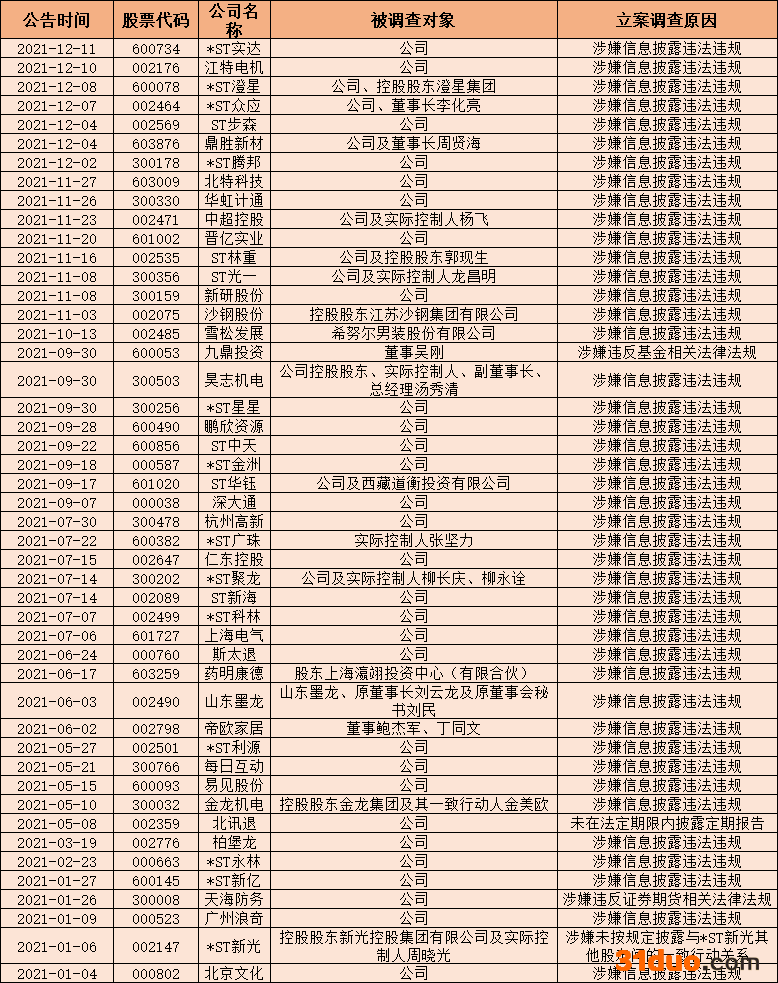 时代财经注意到,A股市场2021年披露的第一起立案调查,也是“涉嫌信息披露违法违规”。