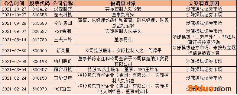 例如,10月27日,汉森制药(002412.SZ)公告称,因涉嫌操纵证券市场,公司实际控制人刘令安被中国证监会立案调查。9月7日,*ST金洲(000587.SZ)公告称,因涉嫌操纵证券市场,公司实际控制人朱要文被立案调查;7月30日,新美星(300509.SZ)公告称,“控股股东、实际控制人之一何德平因涉嫌操纵证券市场、未按规定履行信息披露义务,中国证监会决定对其立案。”