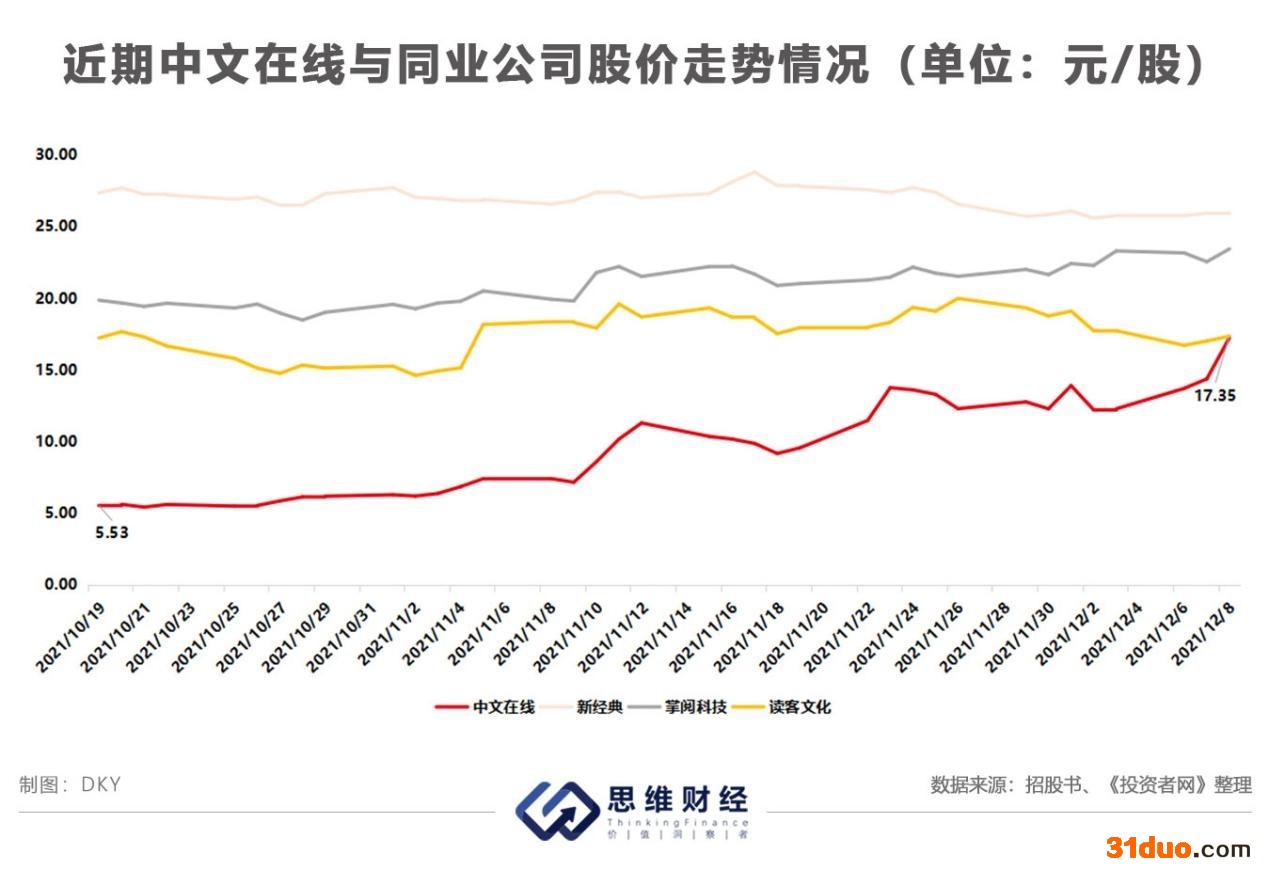 公司的股价也随即上涨,与掌阅科技(603533.SH)、新经典(603096.SZ)等同业公司相比,出现了较大偏离。11月12日,交易所针对中文在线的股价走势、深交所易互动上的回复以及公司股东的减持计划等问题,给中文在线发去了关注函。