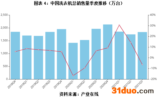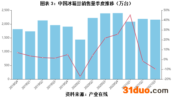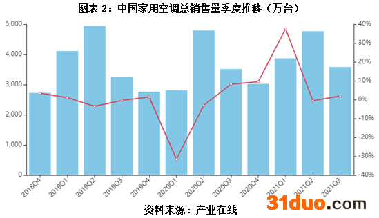 【空调、冰箱、洗衣机季度销售量走势】产业在线数据显示,2021年Q3空调总销量为3583.2万台,同比增长1.94%,较2019年同期增长10%。其中内销量为2380.5万台,同比增长0.63%;外销量为1202.7万台,同比增长4.62%。2021年1-9月,冰箱、洗衣机销量分别为6454、5436万台,分别同比增加6.4%、25.7%。