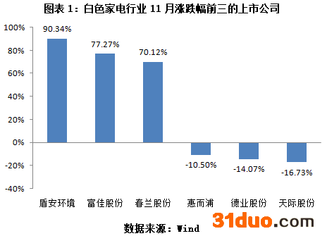 11月,沪深300指数下跌1.56%,白色家电(申万二级)指数下跌0.4%,在104个申万二级行业指数中排名第78名,跑赢沪深300指数1.52个百分点。