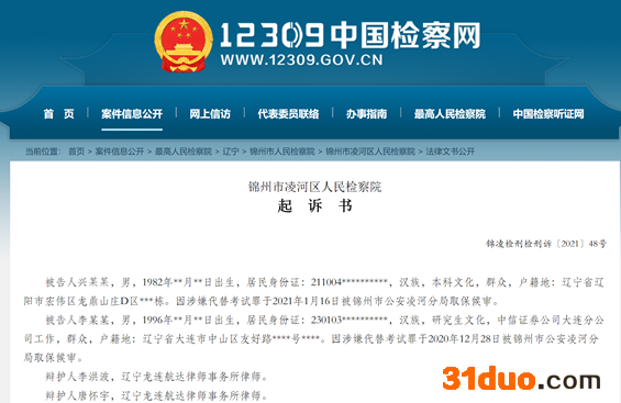 12月9日,时代周报记者从中国检察网上看到了相关的起诉书。内容显示,被告人李某某,男,1996年出生,研究生文化,中信证券公司大连分公司工作,因涉嫌代替考试罪于2020年12月28日被锦州市公安局凌河分局取保候审。