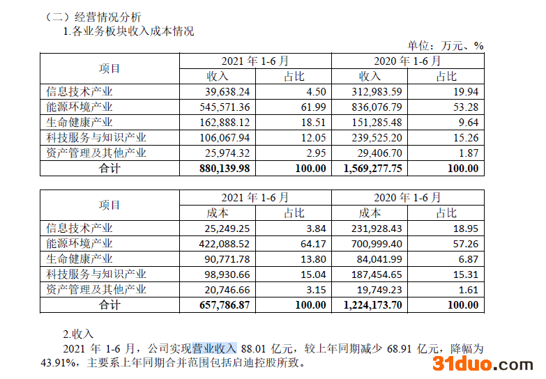 能源环境产业收入占总收入的61.99%,生命健康产业收入占总收入的18.51%,科技服务与知识产业收入占总收入的12.05%,信息技术产业占总收入的4.5%,资产管理及其他产业占总收入的2.95%。其中,信息技术产业收入占比去年同期为19.94%,今年同期收缩了约27亿元。