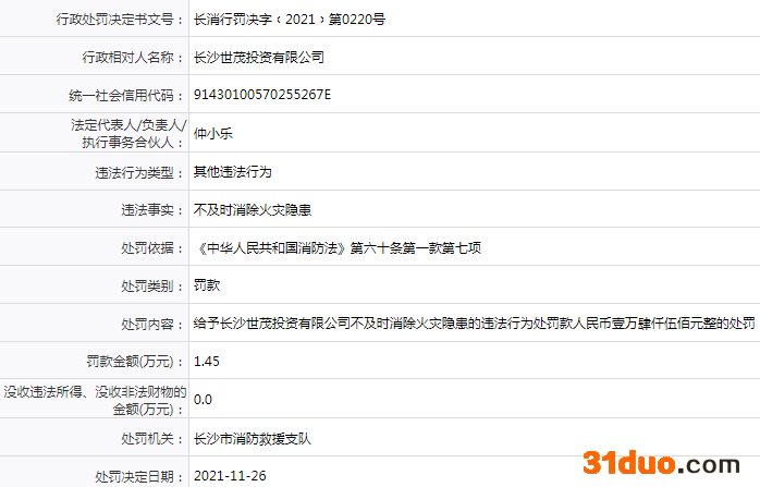 中国经济网北京12月13日讯 (记者 张海蛟) 近日,长沙市消防救援支队对长沙世茂投资有限公司(以下简称:“长沙世茂投资”)罚款1.45万元,处罚事由为其存在不及时消除火灾隐患的违法事实。