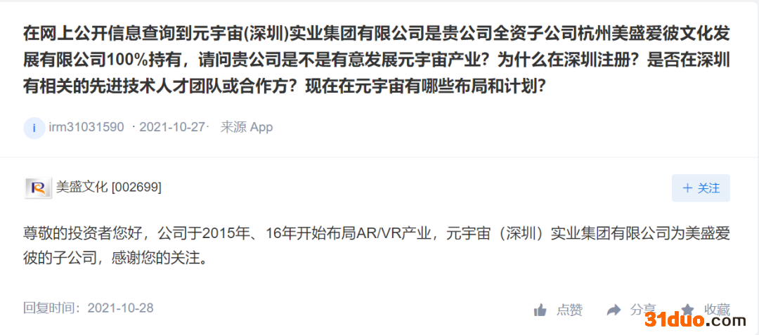 美盛文化于2015年、2016年开始布局AR/VR产业,旗下还有一家元宇宙公司。