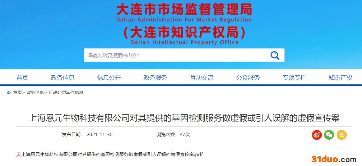 当事人在基因检测过程中,使用“上海恩元生物科技有限公司基因检测样本采集盒”,该采集盒内部包含“一次性生物学样本采集材料”,该采集材料内部包含“精神疾病药物基因组学样标本采集卡”,通过该采集卡标注的医械注册号(黔械注准20192220107),在国家药品监督管理局网站,通过国产医疗器械产品(注册)查询到该采集卡属于第二类医疗器械。当事人涉嫌无证生产经营二类医疗器械的违法线索,依据《市场监督管理行政处罚程序规定》第十四条的规定,已将该违法线索通过《案件移送函》(大市监案移[2021]4-5号)移送至上海市药品监督管理局处理。