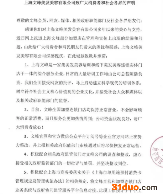 遭遇网友和媒体质疑的上海文峰,在公司被监管部门立案调查、官网被关闭、“黑历史”被扒出后,终于发声明致歉。12月12日,针对近日网上报道上海文峰部分加盟店在管理和宣传上出现的纰漏和问题,上海文峰发布声明,上海文峰美发美容有限公司深感愧疚,在此诚恳致歉。