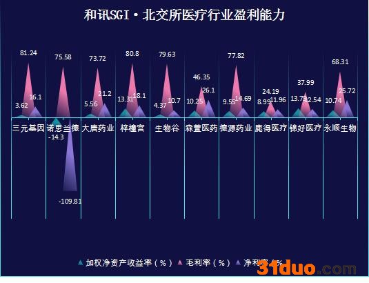 北交所的医药企业和讯SGI指数分别为三元基因75、诺思兰德67、大唐药业79、梓橦宫79、生物谷69、森萱医药85、德源药业85、鹿得医疗73、锦好医疗66、永顺生物77。
