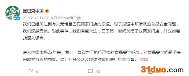 星巴克中国表示,已经关注到有关无锡星巴克两家门店的报道。对于报道中所涉及的食品安全问题,深感震惊。对此事件,公司高度关注,已于第一时间关闭了这两家门店,并立刻启动深入调查。