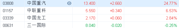 同为机械板块的其他个股也纷纷上涨,其中中联重科(03808.HK)和中国龙工(03339.HK)大涨,其分别上涨为6.53%和2.84%。