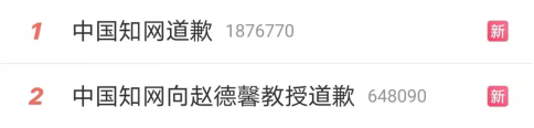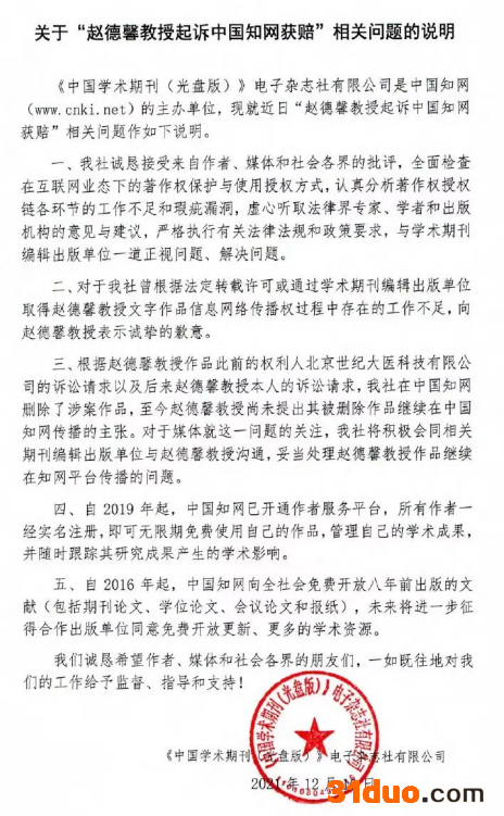 12月10日,中国知网发布《关于“赵德馨教授起诉中国知网获赔”相关问题的说明》,表示向赵德馨教授道歉,并提出将妥当处理赵德馨教授作品继续在知网平台传播的问题。