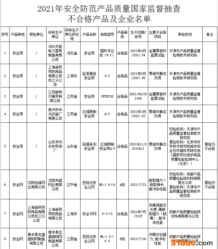 安全网抽查结果分析。安全网是指用来防止人和物坠落,或用来避免、减轻坠落及物击伤害的网具,主要用于各种建筑工地,特别是高层建筑、造船、桥梁建造等高空作业场所。本次抽查了12个省(区、市)56家企业生产的56批次安全网产品,发现3批次产品不合格,不合格发现率为5.4%。重点抽查了安全平网、安全立网、密目式安全立网等3类产品,对耐冲击性能、阻燃性能、开眼环扣强力、耐贯穿性能等项目进行了检验。抽查发现3批次不合格产品均存在多个项目不合格的问题。经技术机构分析,不合格原因主要有三点,一是企业对原材料选用不当,可能使用了再生塑料作为原料;二是生产管控不严,对产品拉丝过程温度与时间控制不合理;三是成品出厂检验力度不够,未能及时发现质量问题。从近3次国家监督抽查情况看,该产品不合格发现率逐年递减,分别为12.7%、12.0%、5.4%。