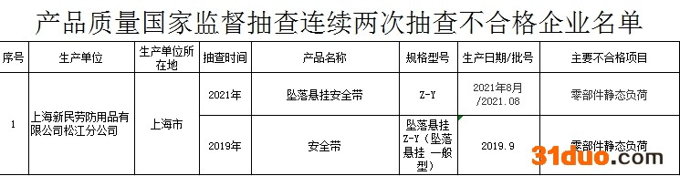 安全带抽查结果分析。安全带是高处作业人员预防坠落伤亡的防护用具,由带、绳和金属配件组成,广泛应用于制造、建筑、造船、石油化工、电力等行业,是一种重要的特种劳动防护用品。本次抽查了10个省(市)92家企业生产的92批次安全带产品,发现5批次产品不合格,不合格发现率为5.4%。重点对金属零部件盐雾试验、整体静态负荷、整体动态负荷、整体滑落等项目进行了检验。抽查发现2批次金属零部件盐雾试验项目不合格,3批次零部件静态负荷项目不合格。经技术机构分析,金属零部件盐雾试验不合格原因是企业对安全带零部件质量进厂把关不严,采购的金属零部件表面涂层抗盐雾腐蚀性能较差;零部件静态负荷不合格原因是扎紧扣、调节扣等金属零部件强度较差,未达到测试负荷要求。从近3次国家监督抽查情况看,该产品质量稳步提升,不合格发现率分别为11.5%、9.3%、5.4%。