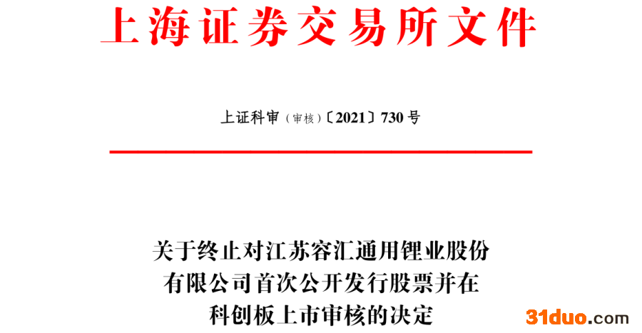 中国经济网北京12月13日讯 据上交所官网消息,上交所决定终止江苏容汇通用锂业股份有限公司(以下简称“容汇锂业”)首次公开发行股票并在科创板上市审核。