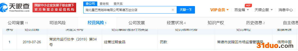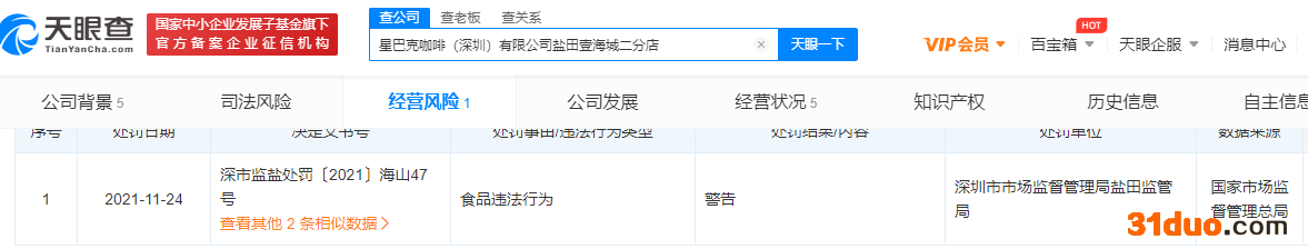 而中国经济网记者在天眼查发现,星巴克部分门店曾因食品问题被处罚。星巴克咖啡(深圳)有限公司盐田壹海城二分店因食品违法行为被警告;湖北星巴克咖啡有限公司常德万达分店因经营过期食品被罚款。此外,成都星巴克咖啡有限公司重庆商业大厦分店、重庆城市阳台分店等曾因产品责任纠纷被起诉。