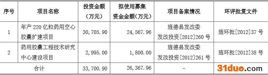 根据黄山胶囊2016年10月12日披露的招股说明书,该公司拟募集资金2.64亿元,分别用于年产220亿粒药用空心胶囊扩建项目和药用胶囊工程技术研究中心建设项目。