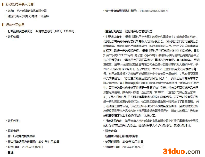 中国经济网北京12月13日讯 国家企业信用信息公示系统日前更新行政处罚决定书(钱塘市监处罚〔2021〕15148号)显示,杭州郝姆斯食品有限公司未经奥林匹克标志权利人授权许可擅自使用奥运元素作为背景,利用与奥运相关的互动话题绑定企业宣传及产品营销。