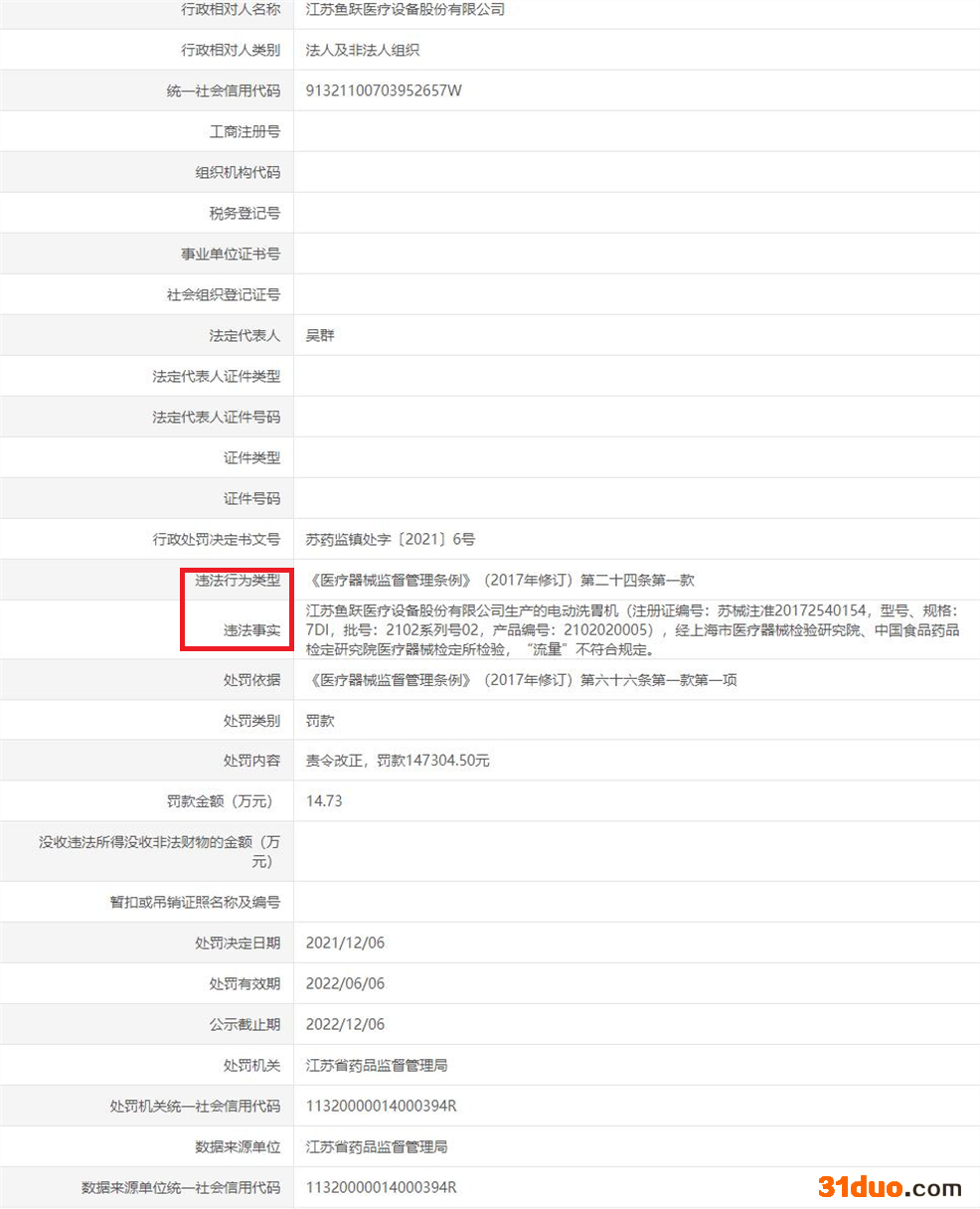 江苏省药品监督管理局依据《医疗器械监督管理条例》(2017年修订)第六十六条第一款第一项规定,对鱼跃医疗责令改正,罚款147304.50元,处罚日期为2021年12月6日。