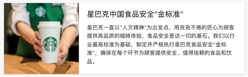 值得注意的是,在星巴克官网社会责任一栏,第二条宣传内容便是:星巴克中国食品安全“金标准”。在该篇文章内,星巴克曾强调,公司一直以“人文精神”为出发点,用孜孜不倦的匠心为顾客提供高品质的咖啡体验,而食品安全是这一切的基石。