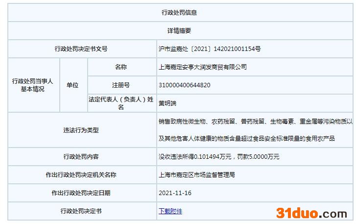 中新经纬12月13日电 据上海市市场监管局网站消息,近日,上海嘉定安亭大润发商贸有限公司被上海市嘉定区市场监管局罚款5万元,并没收违法所得1000余元。涉及的违法行为类型是“销售致病性微生物、农药残留、兽药残留、生物毒素、重金属等污染物质以及其他危害人体健康的物质含量超过食品安全标准限量的食用农产品”。