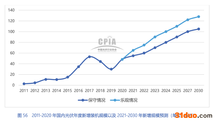 从中国光伏行业协会报告可见,2018年光伏装机量同比下滑,2019年跌进谷底。时至今日,2021年国内的年度光伏新增装机规模或将回到2017年水平。
