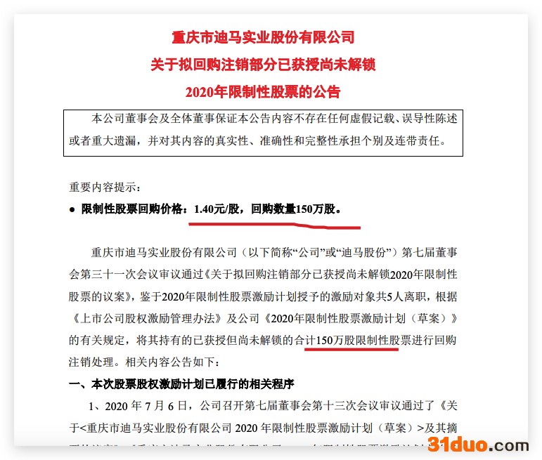 中华网财经12月14日讯:重庆市迪马实业股份有限公司(简称:迪马股份,600565.SH)发布公告称,公司第七届董事会第三十一次会议审议通过《关于拟回购注销部分已获授尚未解锁2020年限制性股票的议案》,鉴于2020年限制性股票激励计划授予的激励对象共5人离职,根据《上市公司股权激励管理办法》及公司《2020年限制性股票激励计划(草案)》的有关规定,将其持有的已获授但尚未解锁的合计150万股限制性股票进行回购注销处理。