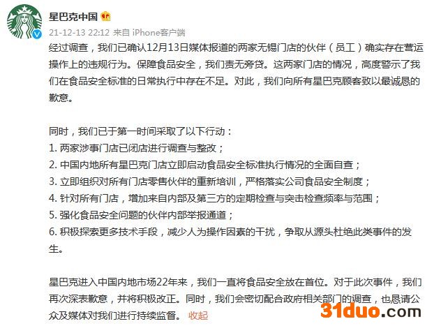 中新经纬12月13日电 13日晚,星巴克中国在微博发文称,经过调查,已确认媒体报道的两家无锡门店的伙伴(员工)确实存在营运操作上的违规行为。对此,向所有星巴克顾客致以最诚恳的歉意。