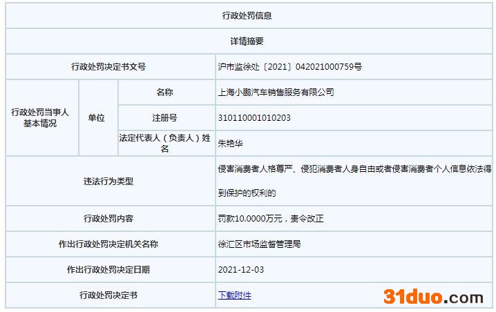 行政处罚信息称,经听证,鉴于上海小鹏汽车销售服务有限公司具有符合《中华人民共和国行政处罚法》规定的主动消除或者减轻违法行为危害后果的情形,根据《中华人民共和国行政处罚法》笫三十二条的相关规定,应在原处罚裁量基础上从轻处罚。
