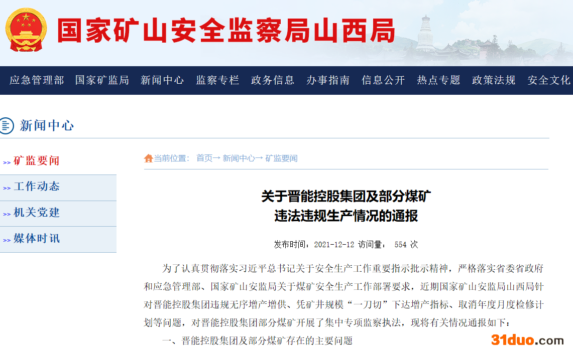 针对晋能控股集团及部分煤矿存在的违法违规行为,国家矿山安全监察局山西局已向晋能控股集团下达了《加强和改善安全管理意见书》,对相关煤矿依法依规作出责令停产整顿、行政罚款、矿长记分等行政处理处罚措施。
