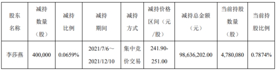 截至公告披露日,李莎燕通过集中竞价交易方式累计减持万泰生物股份40.00万股,占公司总股本的0.0659%,减持总金额为9863.62万元。李莎燕当前持股数量为478.01万股,当前持股比例为0.7874%。