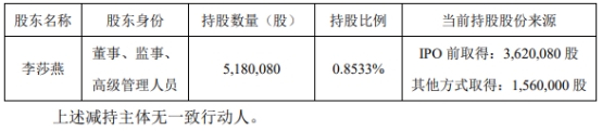 2021年6月12日披露的减持计划显示,万泰生物副总经理李莎燕持有公司股份518.01万股,占公司总股本的0.8533%,上述股份来源于公司首次公开发行股票并上市前取得的股份及上市后公司实施2020年度股利分配方案,即每10股送4股后取得的股份。