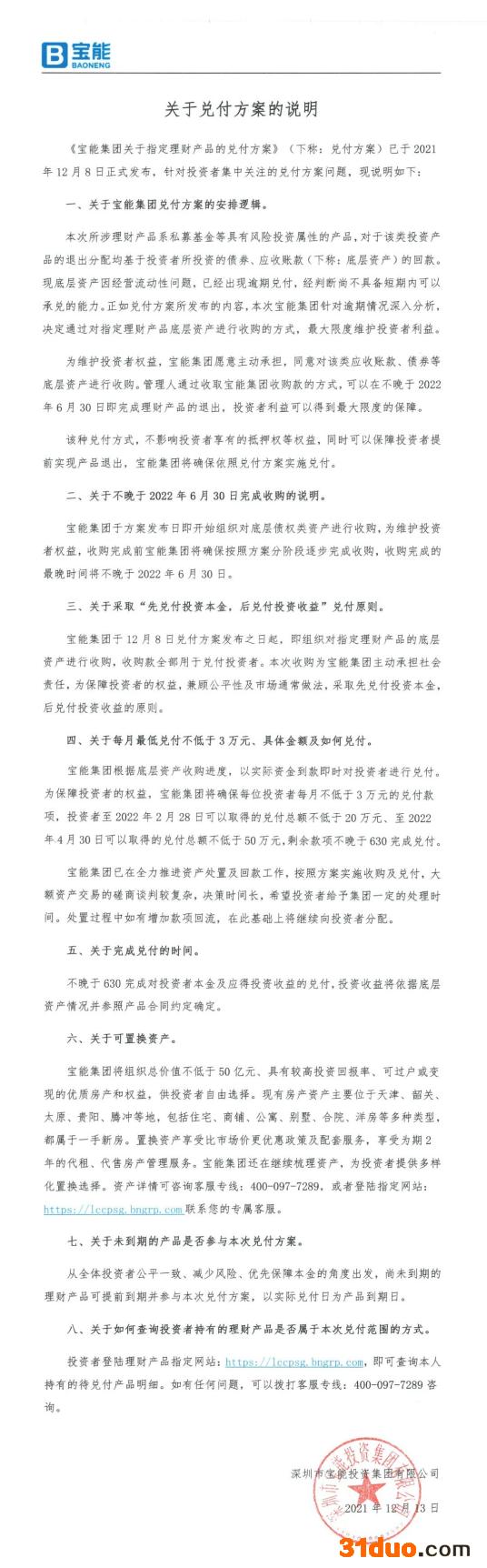 12月13日晚间,宝能集团微信公众号发布兑付方案的答疑。兑付方案已于12月8日正式发布,针对投资者集中关注的兑付方案问题,现就方案的安排逻辑、兑付原则、对付时间和可置换资产作出说明。关于本次兑付中颇受争议的“关于每月最低兑付不低于3万元”,集团表示希望投资者给予集团一定的处理时间,若在处置过程中有增加款项回流,在此基础上将继续向投资者分配。