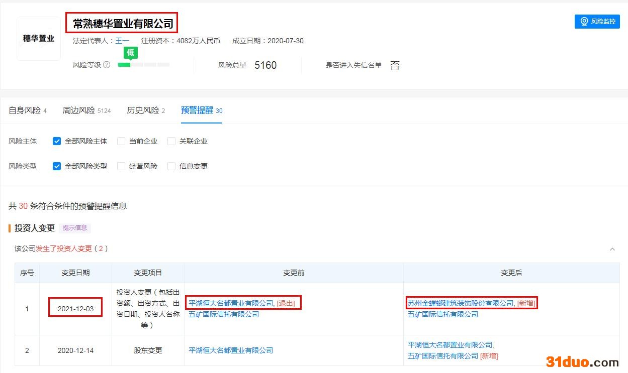 除了这家企业,中新经纬还注意到,2021年12月3日,恒大旗下另一家子公司平湖恒大名都置业有限公司(下称平湖恒大)退出了常熟穗华置业有限公司(下称常熟穗华)股东之列,将约49%的股权转让给金螳螂。同样,常熟穗华此前是由平湖恒大全资持有,于2020年12月14日将约51%的股权转让给五矿信托。