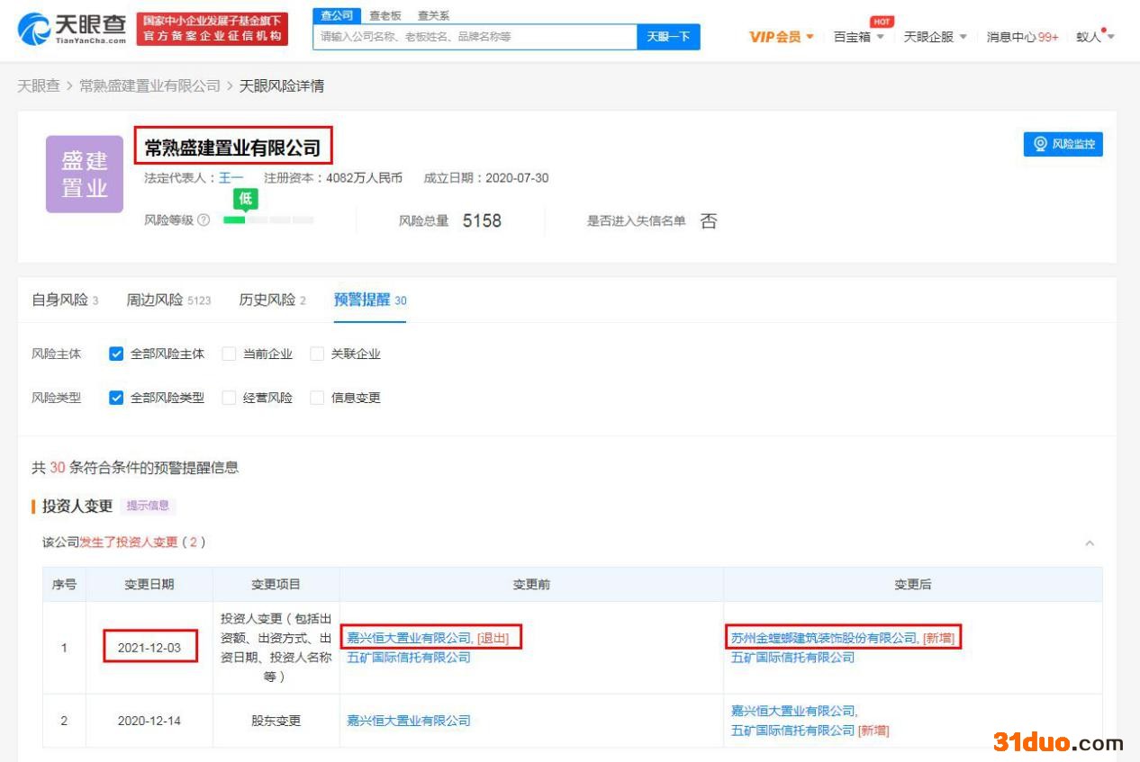 近日,中新经纬查询天眼查发现,在2021年12月3日,恒大地产子公司嘉兴恒大置业有限公司(下称嘉兴恒大)退出常熟盛建置业有限公司(下称常熟盛建)约49%的股权,接手这部分股权的是金螳螂,剩余约51%的股权由五矿国际信托有限公司(下称五矿信托)持有。