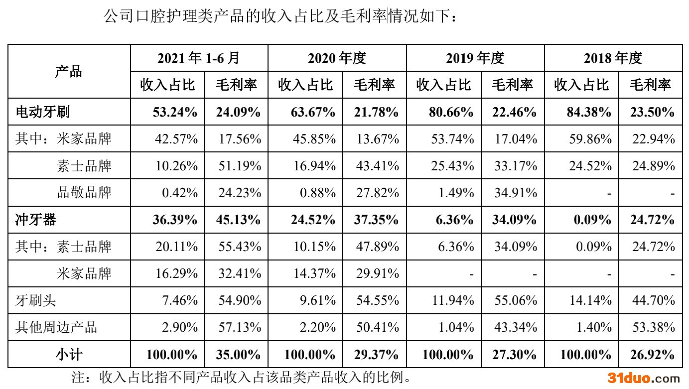 2018年到2021年上半年,米家品牌电动牙刷毛利率为22.94%、17.04%、13.67%和17.56%,2019年,米家品牌电动牙刷毛利率下降,当年推出三款单价较低更具性价比的低毛利新型号产品,且收入占比提升较快,使得当年毛利率下降较多;2020年,毛利率继续下降,毛利率较低的产品销量进一步增加且销售收入占比提升,导致毛利率进一步降低。