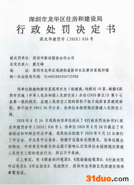 为此,深圳市龙华区住房和建设局于2020年11月17日对深圳新田公司作出“行政处罚决定书”(深龙华建罚字[2020]036号),其中载明,深圳新田公司新建的“新田茗苑“项目为3栋建筑,均超过10层,根据《深圳市实施 中华人民共和国防空法 办法(2020修正)》第十七条第一款的规定,应建人民防空工程的面积不低于地面首层建筑面积,即不低于4893.96平方米,但该公司未按规定修建。同时,该公司已明确无法进行补建。依据相关规定,责令该公司补缴易地建设费17618256元,并作出罚款5万元的行政处罚。