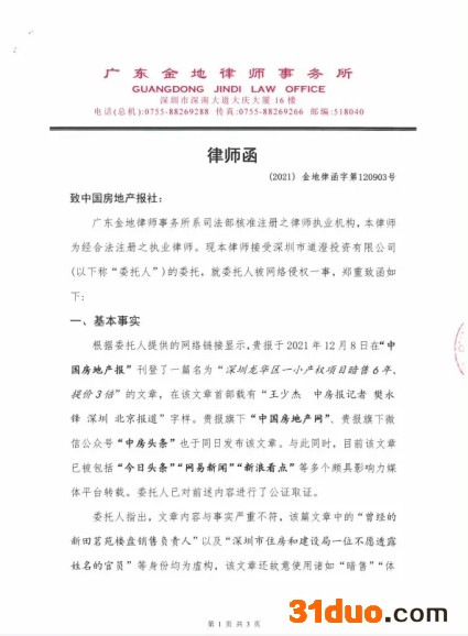 12月10日,中国房地产报记者收到由深圳道澄公司委托广东金地律师事务所发《律师函》,该《律师函》称文章内容与事实严重不符,该篇文章中所引用曾为“新田茗苑”楼盘销售负责人和深圳住房和建设局一位不愿透露姓名的官员等身份为虚构。并称“暗售”“体量庞大”“被指瓜分巨额利益”等词语给委托人造成负面影响。