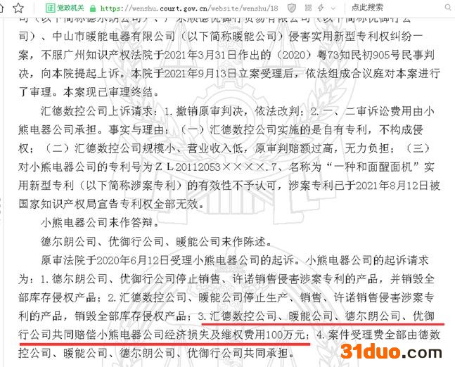 对于上述判决,上诉人广州汇德数控科技有限公司(以下简称汇德数控公司)因与被上诉人小熊电器股份有限公司(以下简称小熊电器公司)、原审被告广东顺德德尔朗贸易有限公司(以下简称德尔朗公司)、广东顺德优御行贸易有限公司(以下简称优御行公司)、中山市暖能电器有限公司(以下简称暖能公司)侵害实用新型专利权纠纷一案,不服广州知识产权法院于2021年3月31日作出的(2020)粤73知民初905号民事判决,向中华人民共和国最高人民法院提起上诉。中华人民共和国最高人民法院于2021年9月13日立案受理后,依法组成合议庭对本案进行了审理。本案现已审理终结。
