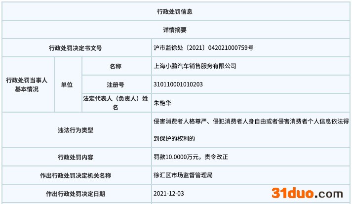 中华网财经12月14日讯,据上海市市场监管局消息,近日,上海小鹏汽车销售服务有限公司(以下简称小鹏汽车或当事人)被徐汇区市场监督管理局罚款10万元。处罚事由为,当事人购买具有人脸识别功能的摄像设备22台安装在旗下门店,以此统计进店人数并分析男女比例、年龄等。今年1月至6月,小鹏汽车共采集上传人脸照片431623张,该行为未经得消费者同意,也无明示、告知消费者收集、使用目的,违反消费者权益保护法。