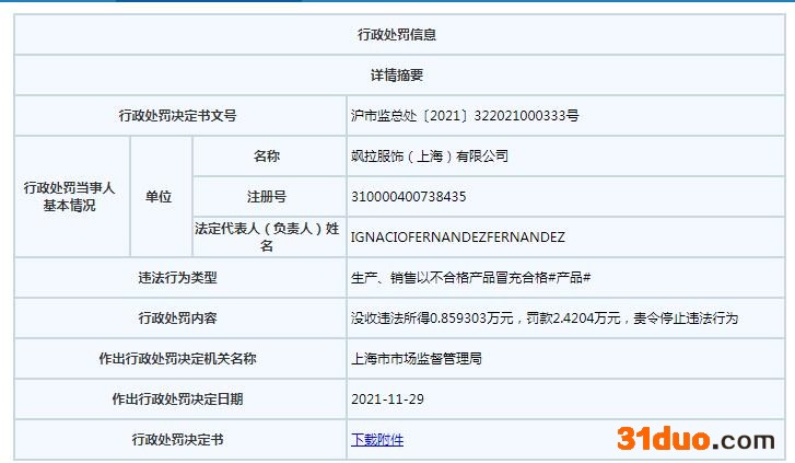 中新经纬12月14日 据上海市市场监管局网站消息,近日,ZARA关联公司飒拉服饰(上海)有限公司被上海市市场监督管理局罚款约2.42万元,并没收违法所得约0.86万元。违法行为类型为“生产、销售以不合格产品冒充合格产品”。