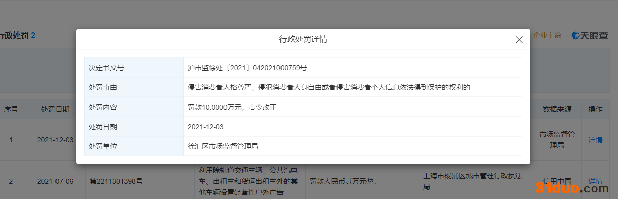 天眼查信息显示,近日,上海小鹏汽车销售服务有限公司因侵害消费者人格尊严、侵犯消费者人身自由或者侵害消费者个人信息依法得到保护的权利,被徐汇区市场监督管理局罚款10万元,并责令改正。