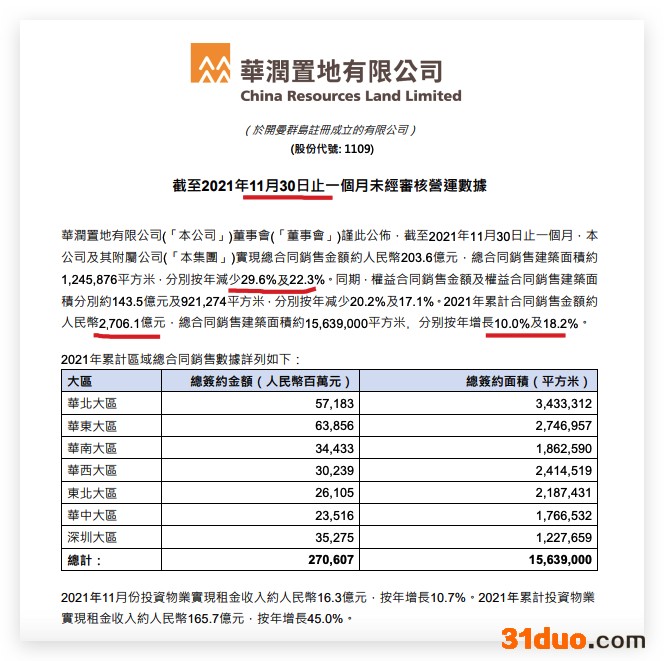 此外,华润置地2021年11月份投资物业实现租金收入约人民币16.3亿元,按年增长10.7%。2021年累计投资物业实现租金收入约人民币165.7亿元,按年增长45.0%。