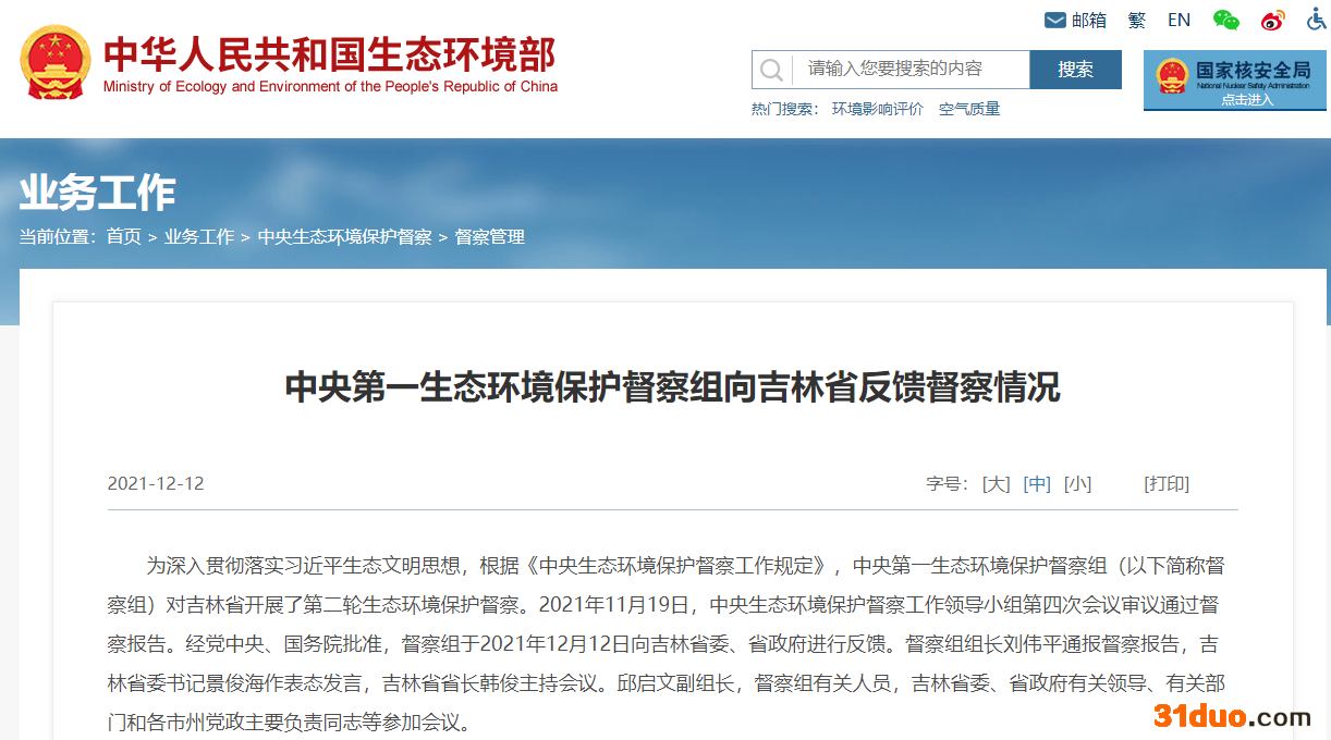 中国网财经12月14日讯 据生态环境部网站消息,12月12日,生态环境部发布“中央第一生态环境保护督察组向吉林省反馈督察情况”。2021年11月19日,中央生态环境保护督察工作领导小组第四次会议审议通过督察报告。截至2021年11月底,督察组交办的4704件群众举报问题均已办结或阶段办结,其中责令整改899家;立案处罚240家,罚款722万元;立案侦查41件,拘留17人,约谈22人,问责144人。