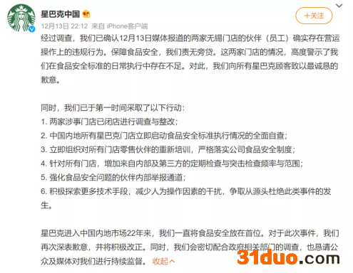 星巴克中国表示,星巴克进入中国内地市场22年来,我们一直将食品安全放在首位。对于此次事件,我们再次深表歉意,并将积极改正。同时,我们会密切配合政府相关部门的调查,也恳请公众及媒体对我们进行持续监督。